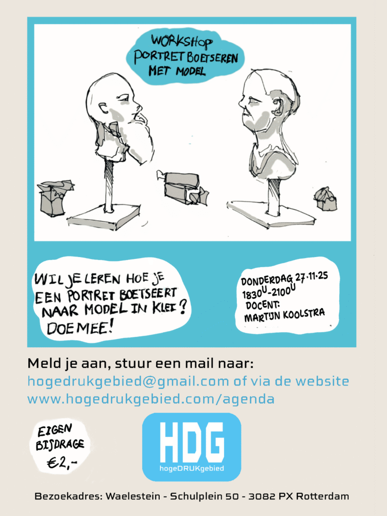 Sinds Oktober 2025 geef ik een workshop Portretboetseren bij Stichting Hogedrukgebied, kunstenaarsinitiatief te Charlois, Rotterdam. Deelname mogelijk door aanmelden, mailto: info@hogedrukgebied.com